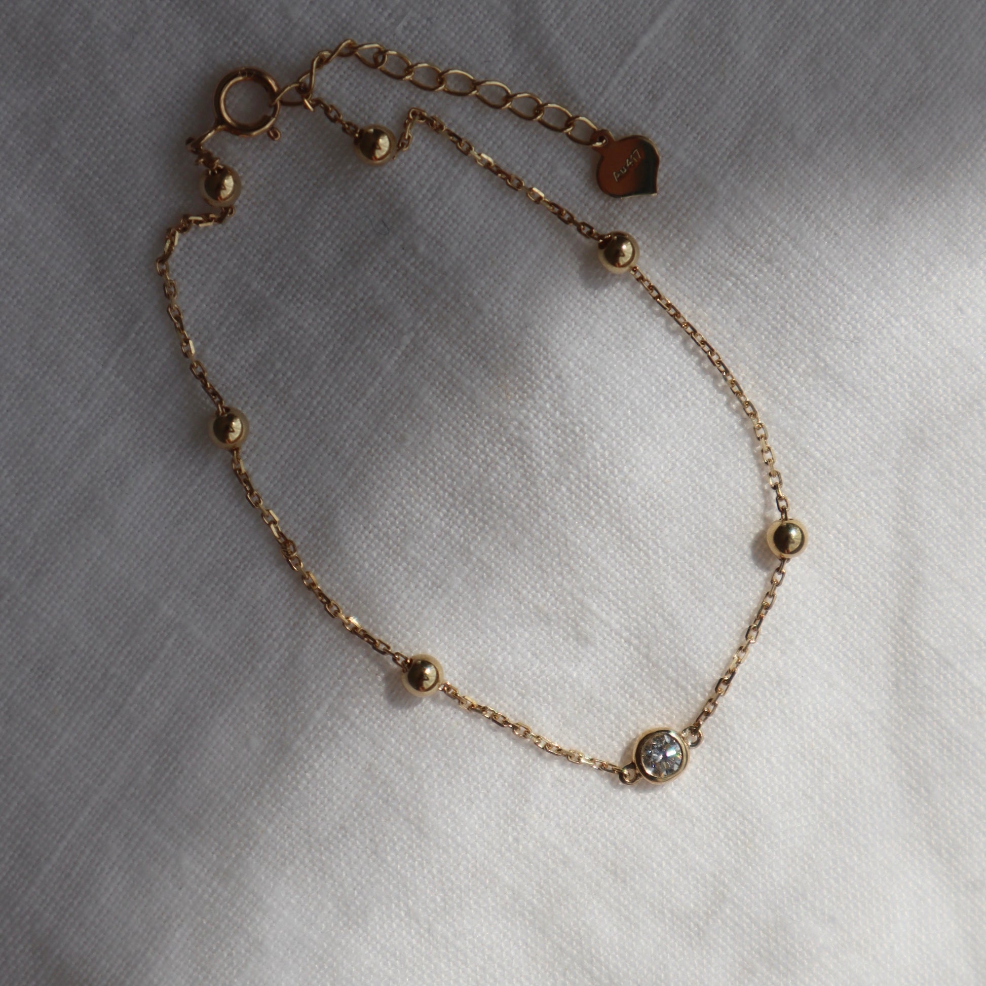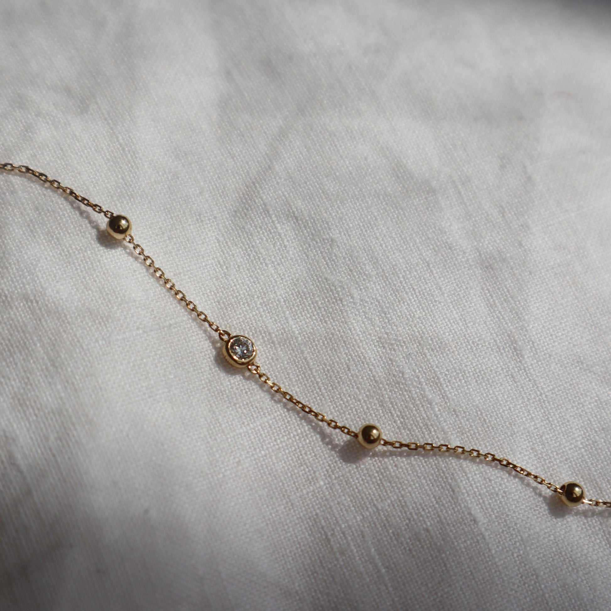 This dainty chain bracelet screams understated elegance with 6 solid gold baubles surrounding the centrepiece bezel-set brilliant round diamond.